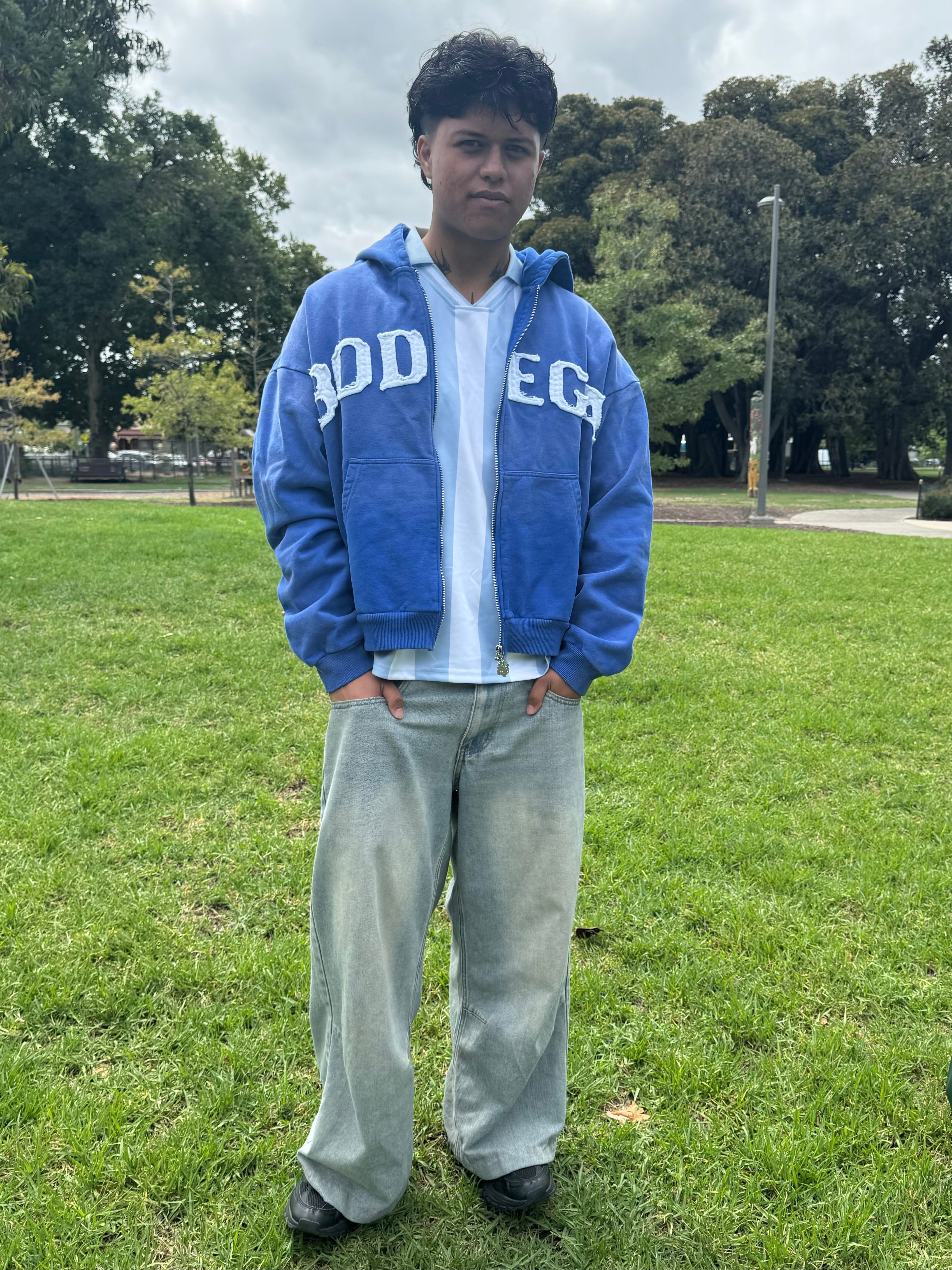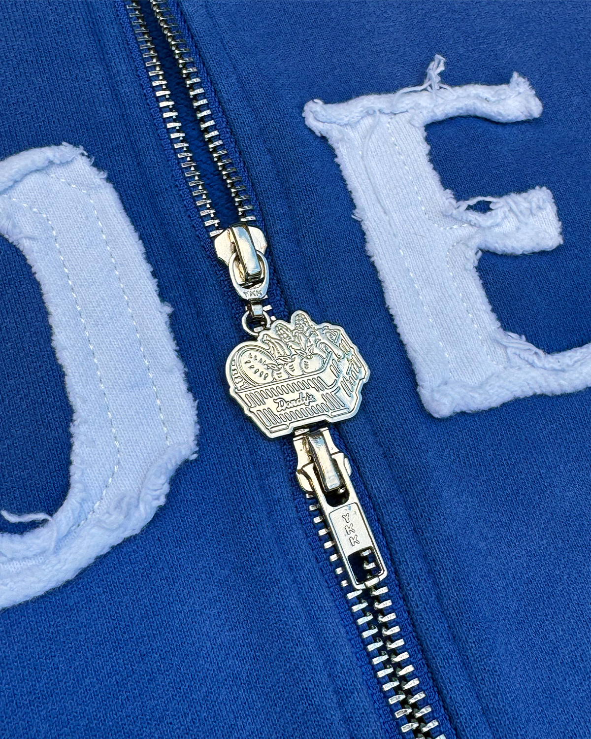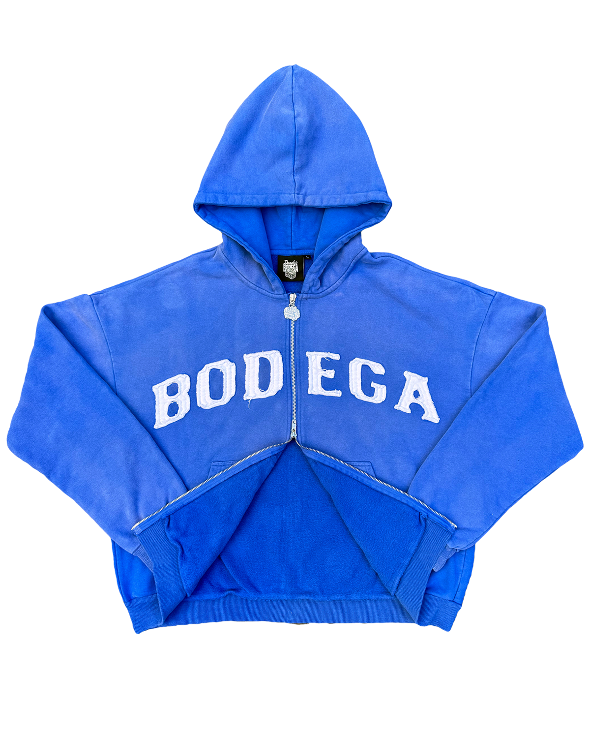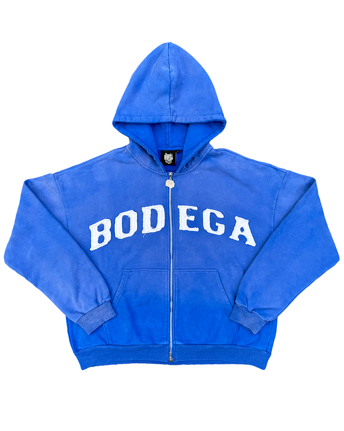 The Dondy’s Bodega Warehouse Jacket is a unisex hooded zip-up jacket. Featuring "BODEGA" distressed text across chest and custom emblem zip.